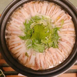 →大根と豚肉に火が通ったら、センターに水菜を入れて出来上がり!