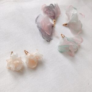 くすみカラーのふわっと優しい色合いの耳飾りできました。
